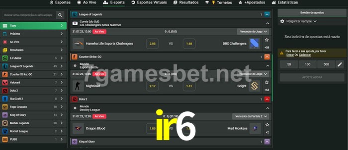O ir6 oferece uma grande seleção de opções de apostas em e-sports com probabilidades competitivas